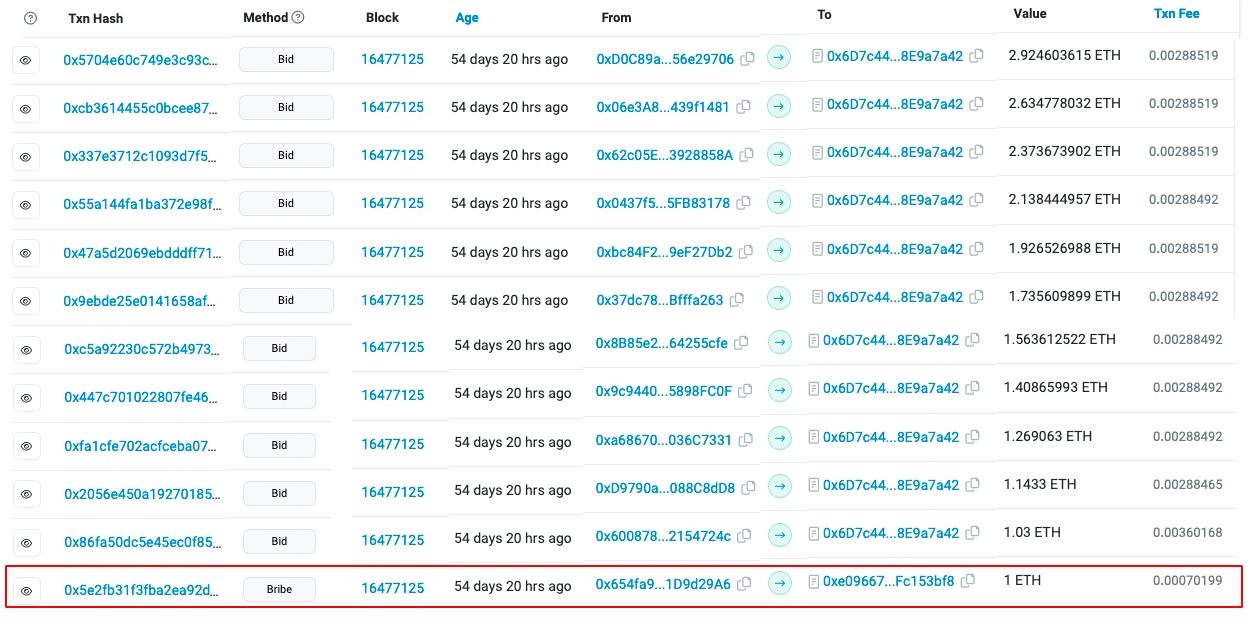 Bongdoe’s SuperRare auction serves as a great introductory case study to MEV botting. His pieces often fetch well over 10 ETH, and naturally these auctions are quite competitive. With a recent mint, there was a very interesting mechanic. Anyone that placed a successful bid, but did not win the auction, would be airdropped an NFT potentially worth 1 ETH each. Additional caveats include that the auction begins on a specific block, with bids placed on-chain in minimum of 10% increments. Bids are refunded if it does not win the auction.