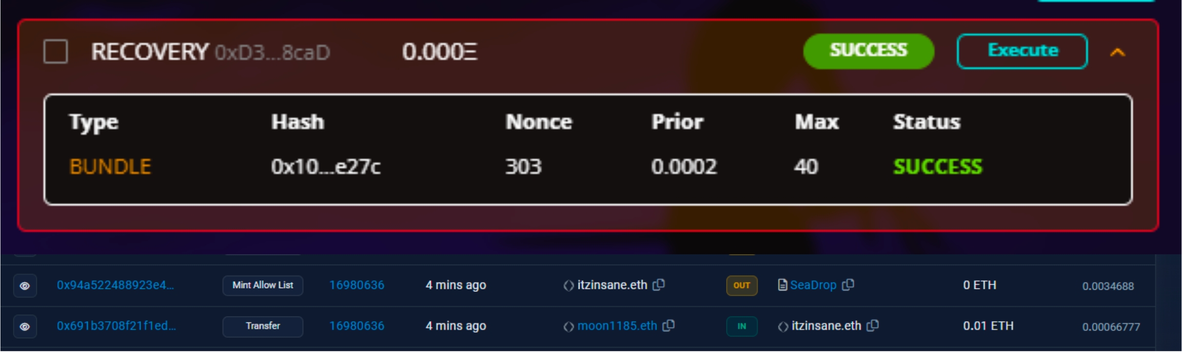 By bundling two transactions that would first deposit ETH into the compromised wallet then minting the NFT using the deposited ETH, this escapes the detection of these particular drainer bots. We then are able to extract the NFTs out of these compromised wallets in a similar fashion.